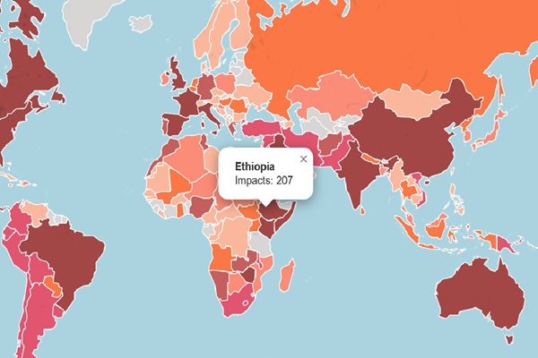 Most affected Countries according to Number of impact reports / Main impact category / Change from 30 days ago